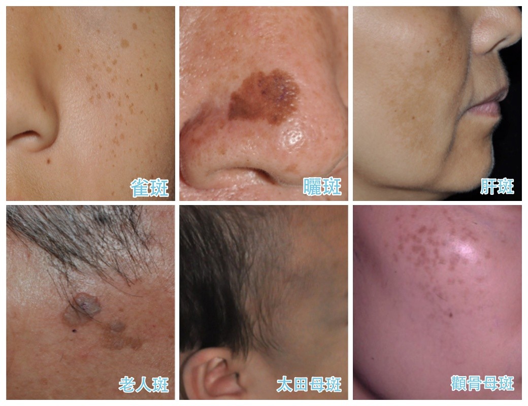 - 混合斑:表皮與真皮皆有色素沉著,如黃褐斑