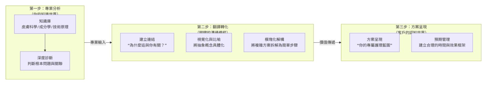 將深奧的皮膚科學轉化為客戶願意買單、且能執行的護理計劃,是美容顧問最核心的價值。這個過程不是「翻譯」,而是 「價值建構」 。以下這套系統化方法,能幫助你將專業知識,轉化為打動人心的解決方案。